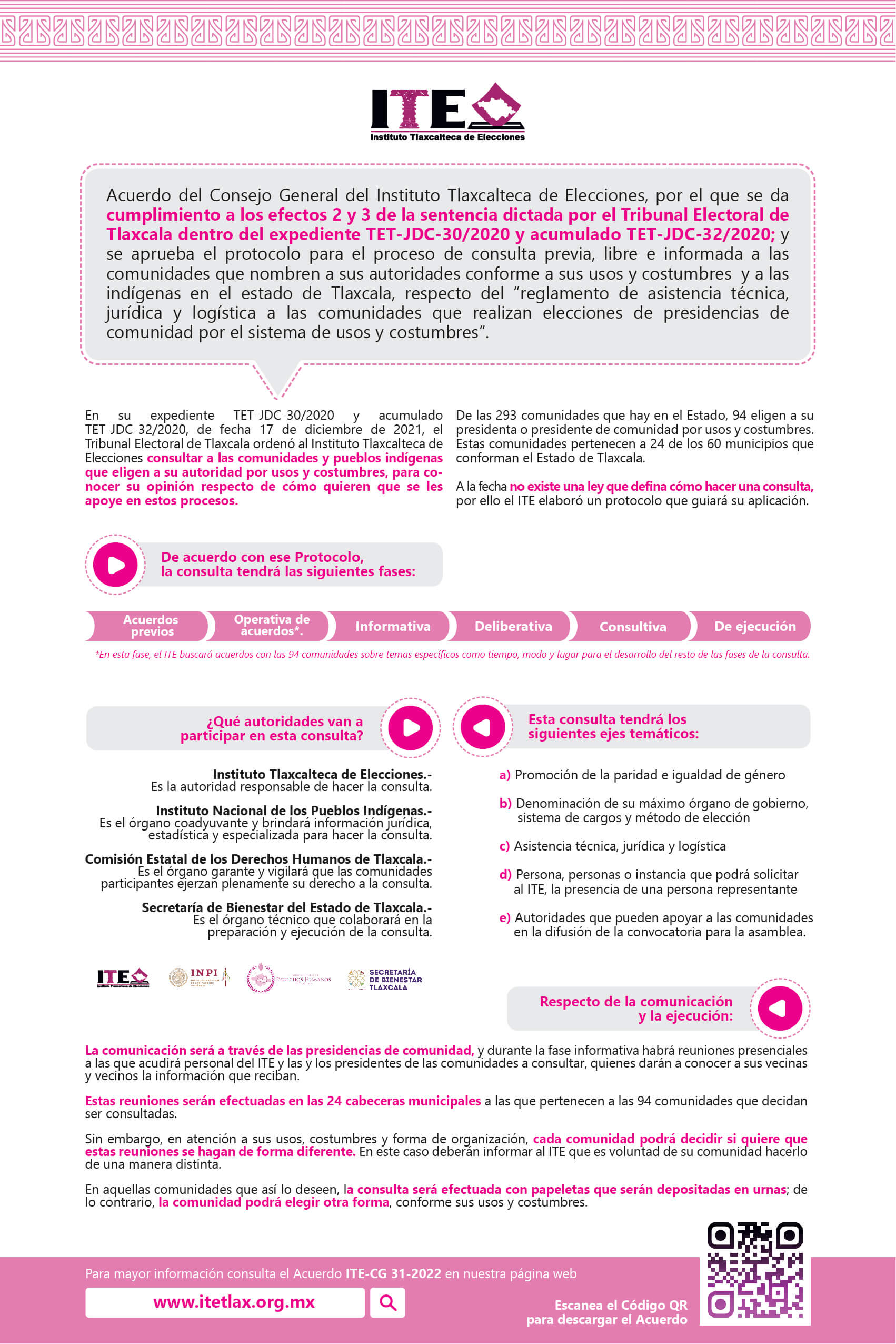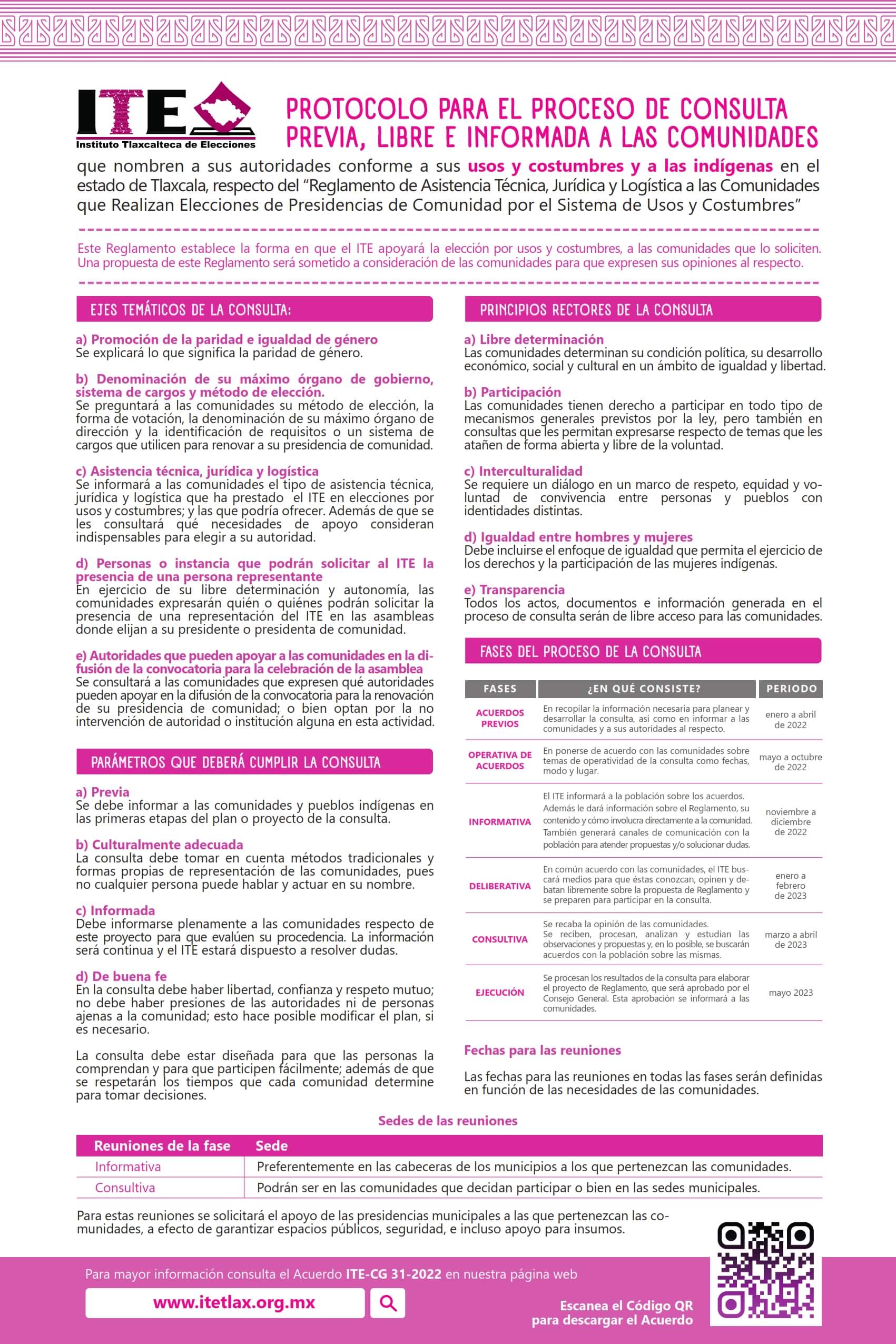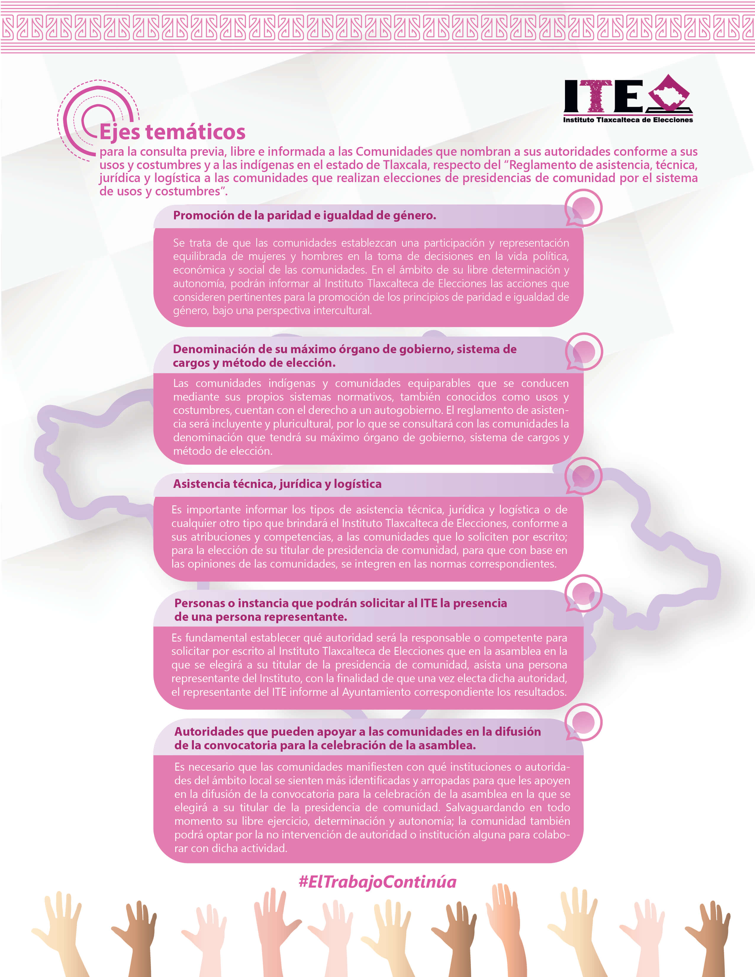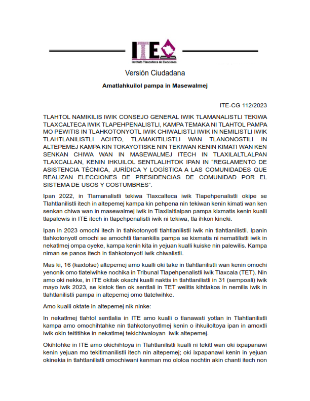 El Instituto Tlaxcalteca de Elecciones (ITE) desarrolla un proceso de consulta previa, libre e informada a las comunidades que eligen a la persona titular de su presidencia de comunidad mediante usos y costumbres, y a las indígenas del Estado, con la finalidad de conocer sus posicionamientos u opiniones sobre diferentes ejes temáticos referentes a normas, principios y criterios que conformarán el Reglamento de Asistencia Técnica, Jurídica y Logística que utilizará esta autoridad cuando las comunidades soliciten asistencia y/o apoyo para sus elecciones. En este sitio encontrarás información relacionada con este ejercicio que es inédito en su tipo en Tlaxcala.