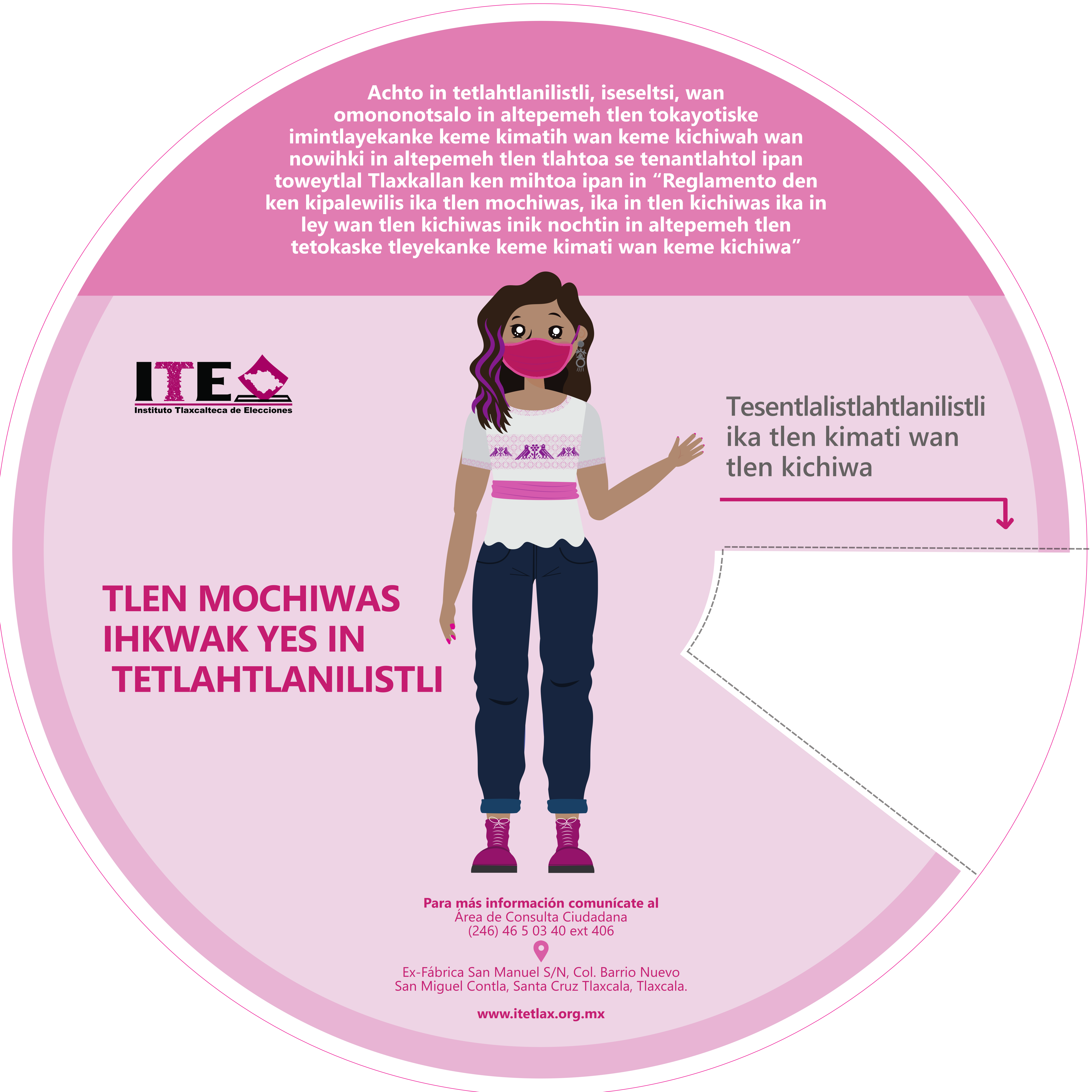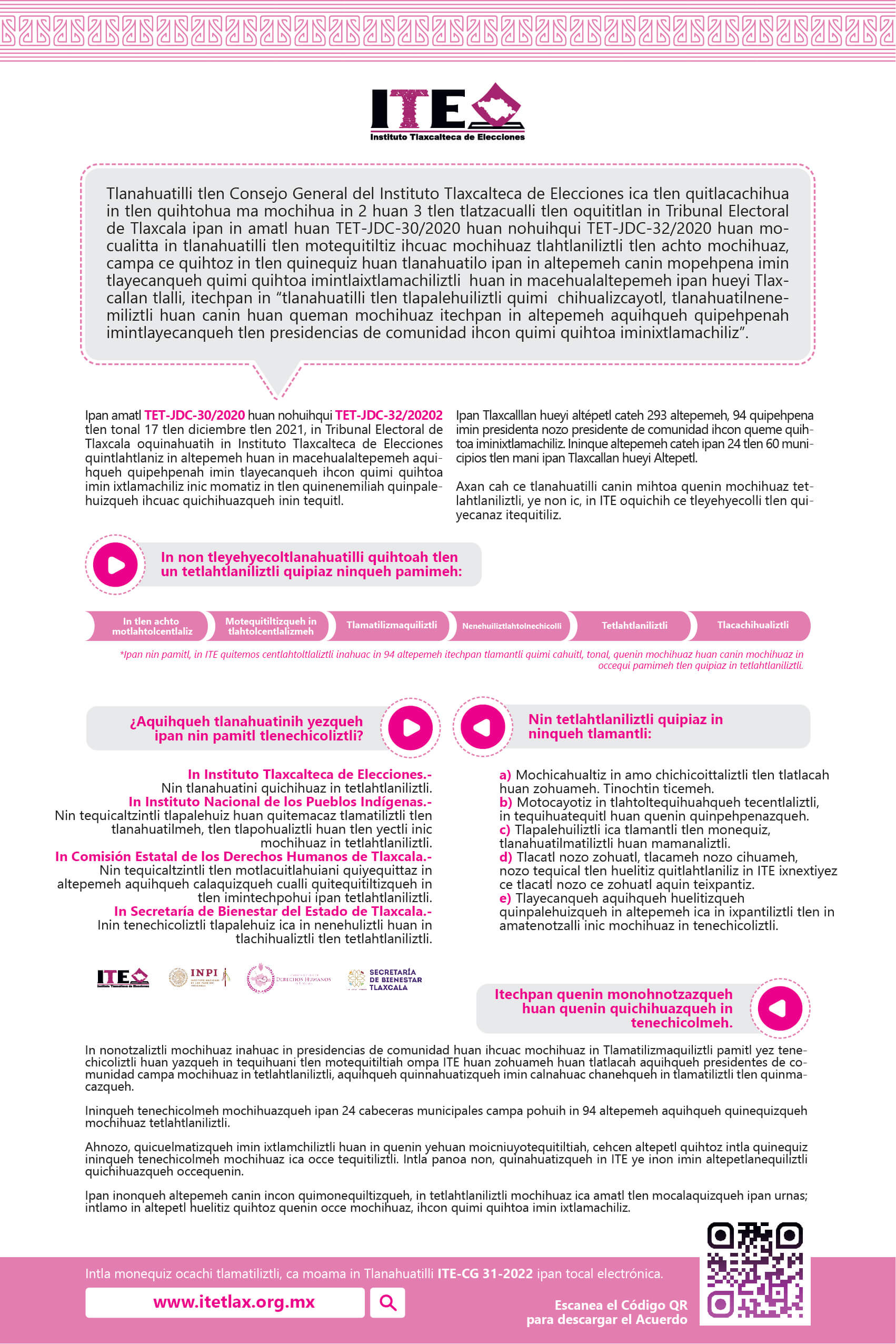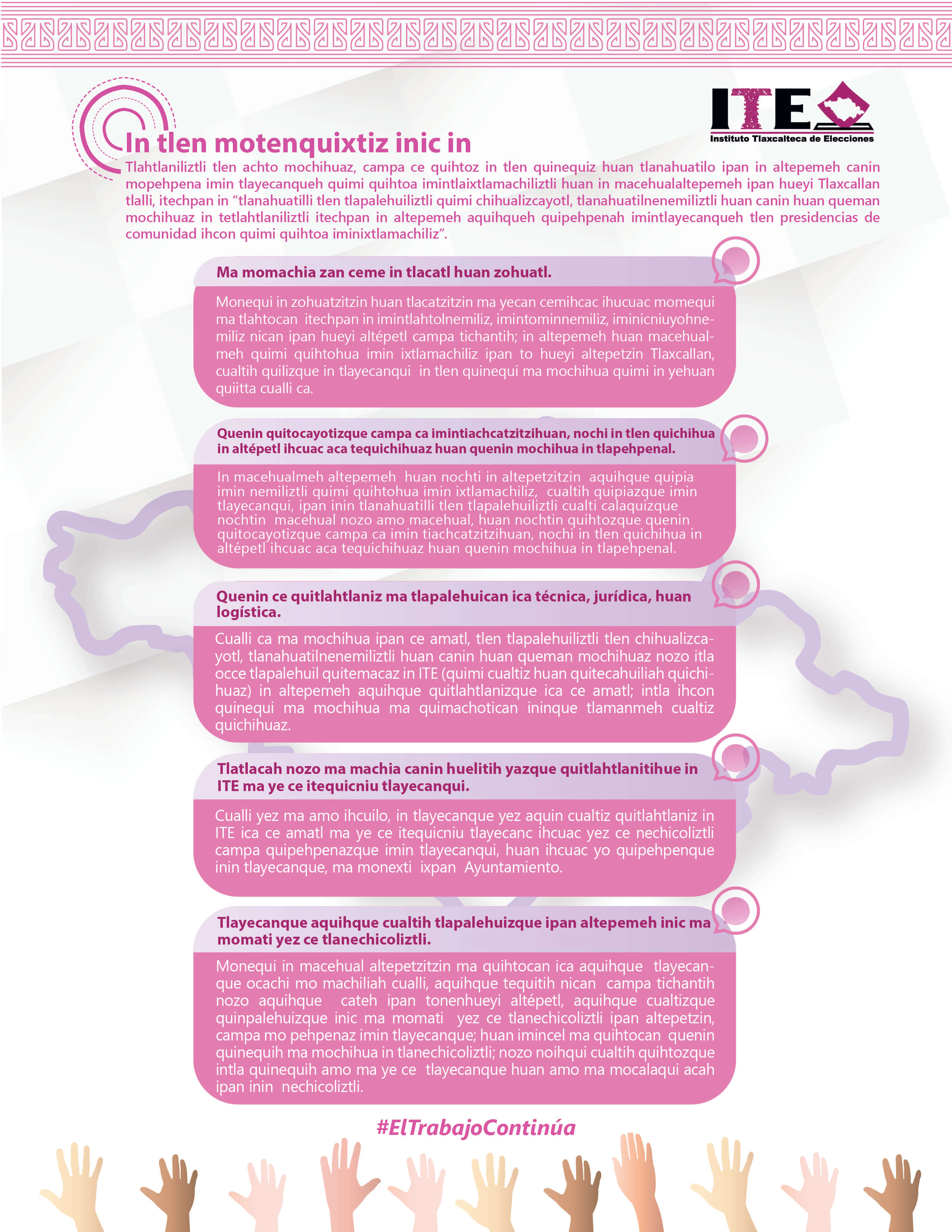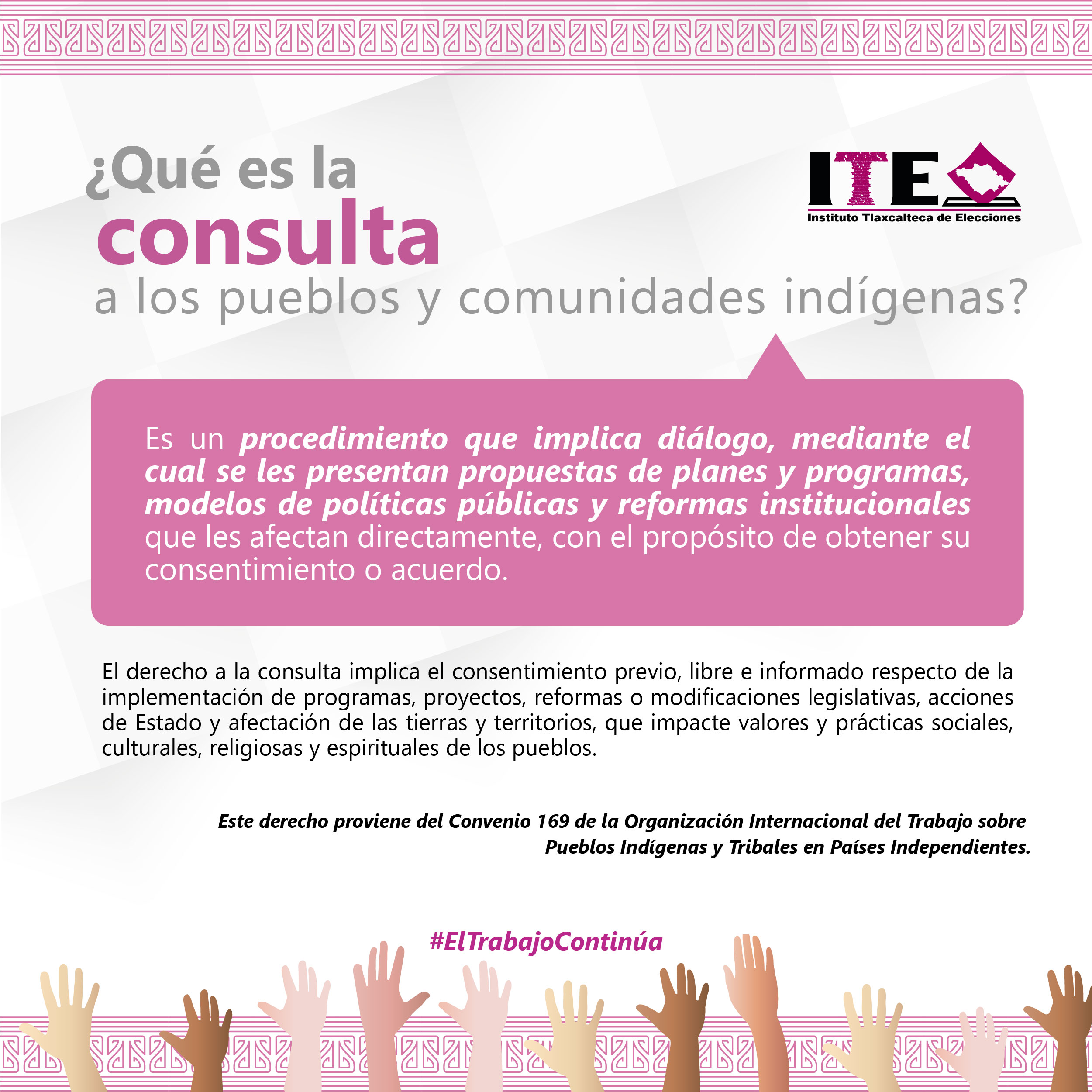 El Instituto Tlaxcalteca de Elecciones (ITE) desarrolla un proceso de consulta previa, libre e informada a las comunidades que eligen a la persona titular de su presidencia de comunidad mediante usos y costumbres, y a las indígenas del Estado, con la finalidad de conocer sus posicionamientos u opiniones sobre diferentes ejes temáticos referentes a normas, principios y criterios que conformarán el Reglamento de Asistencia Técnica, Jurídica y Logística que utilizará esta autoridad cuando las comunidades soliciten asistencia y/o apoyo para sus elecciones. En este sitio encontrarás información relacionada con este ejercicio que es inédito en su tipo en Tlaxcala.