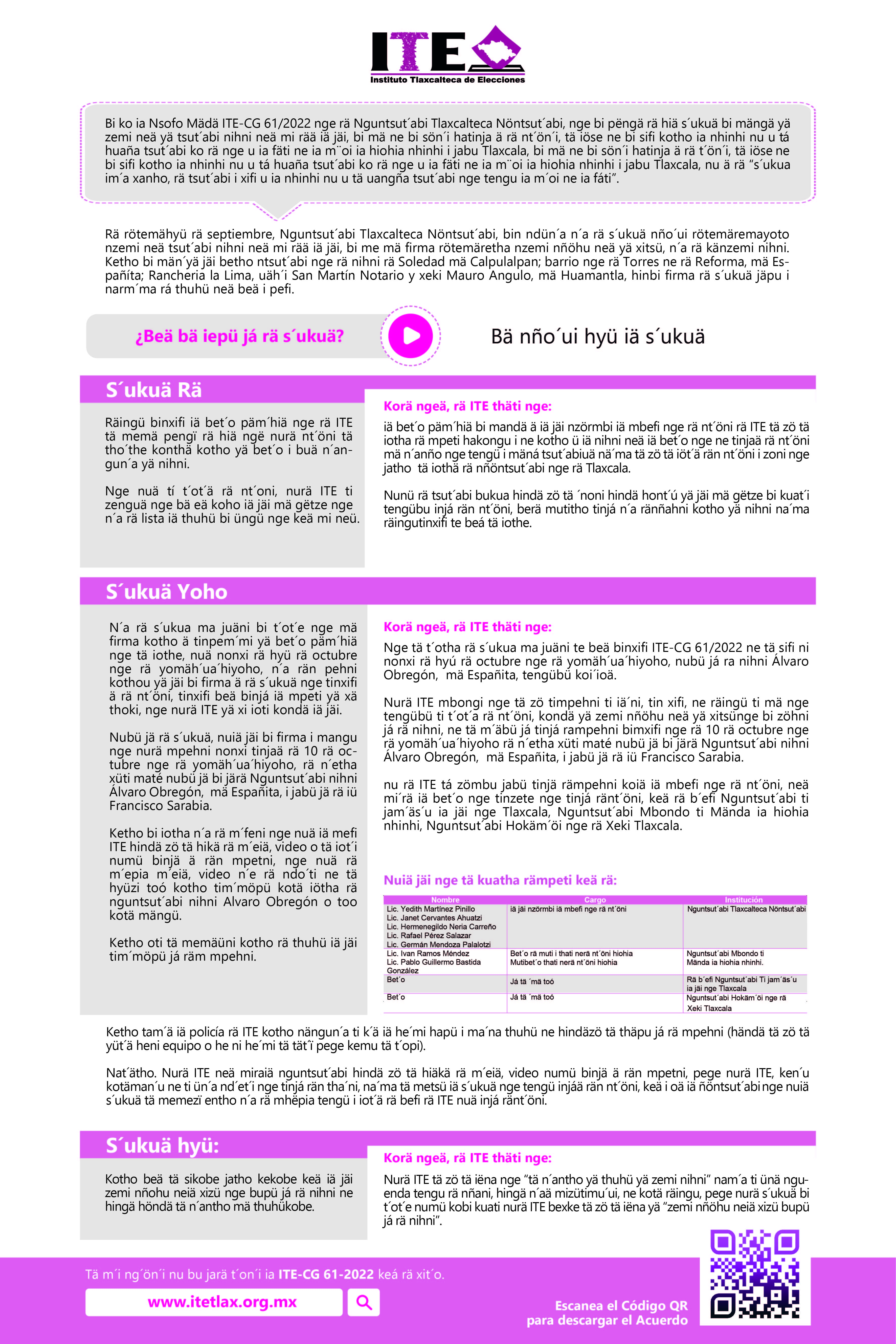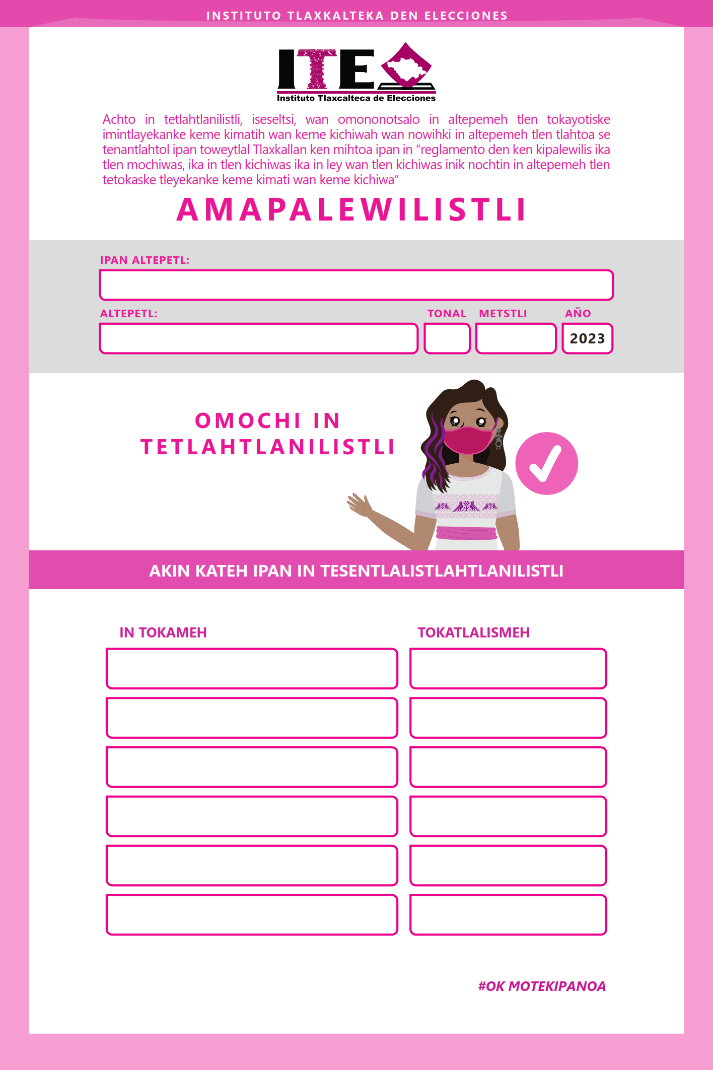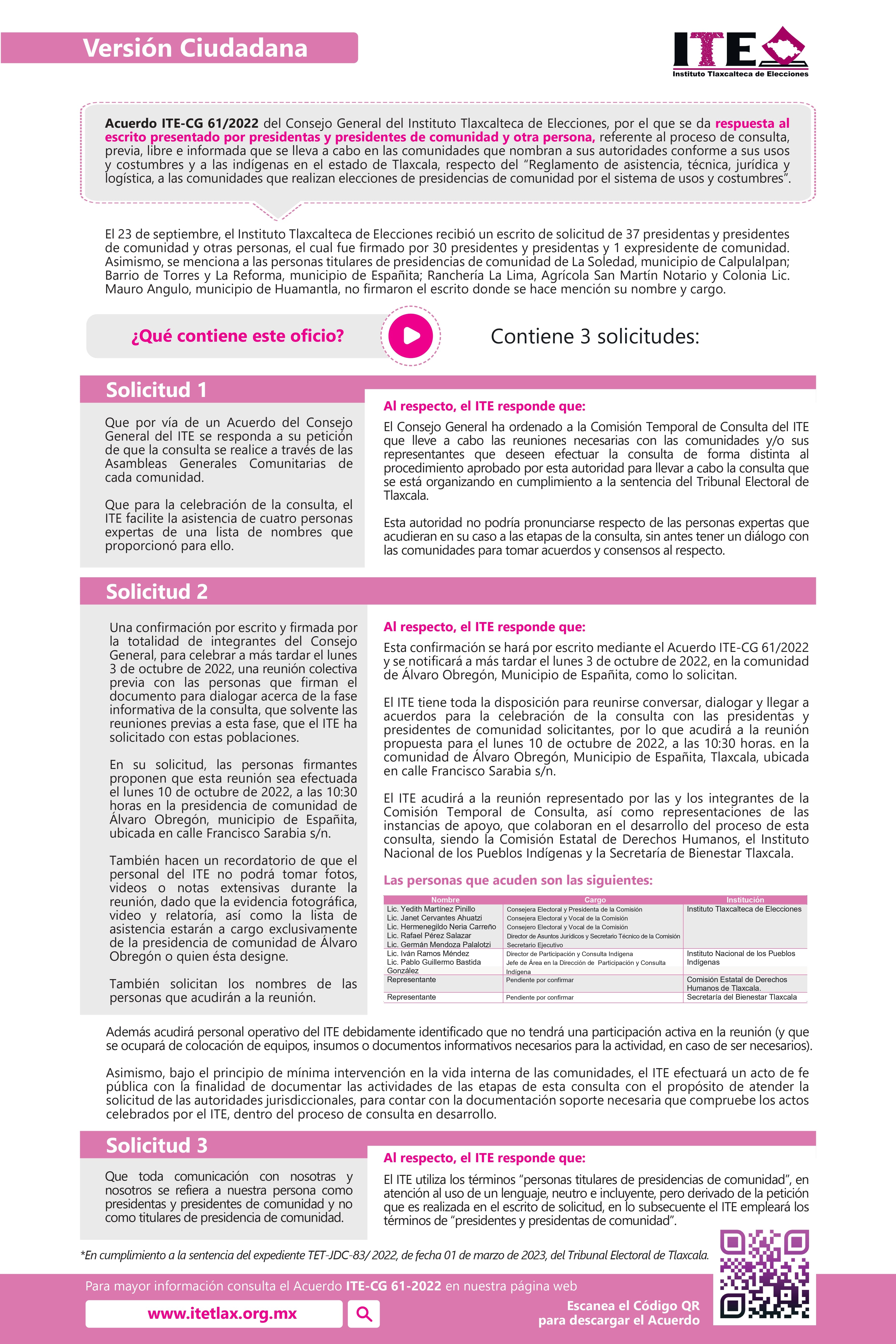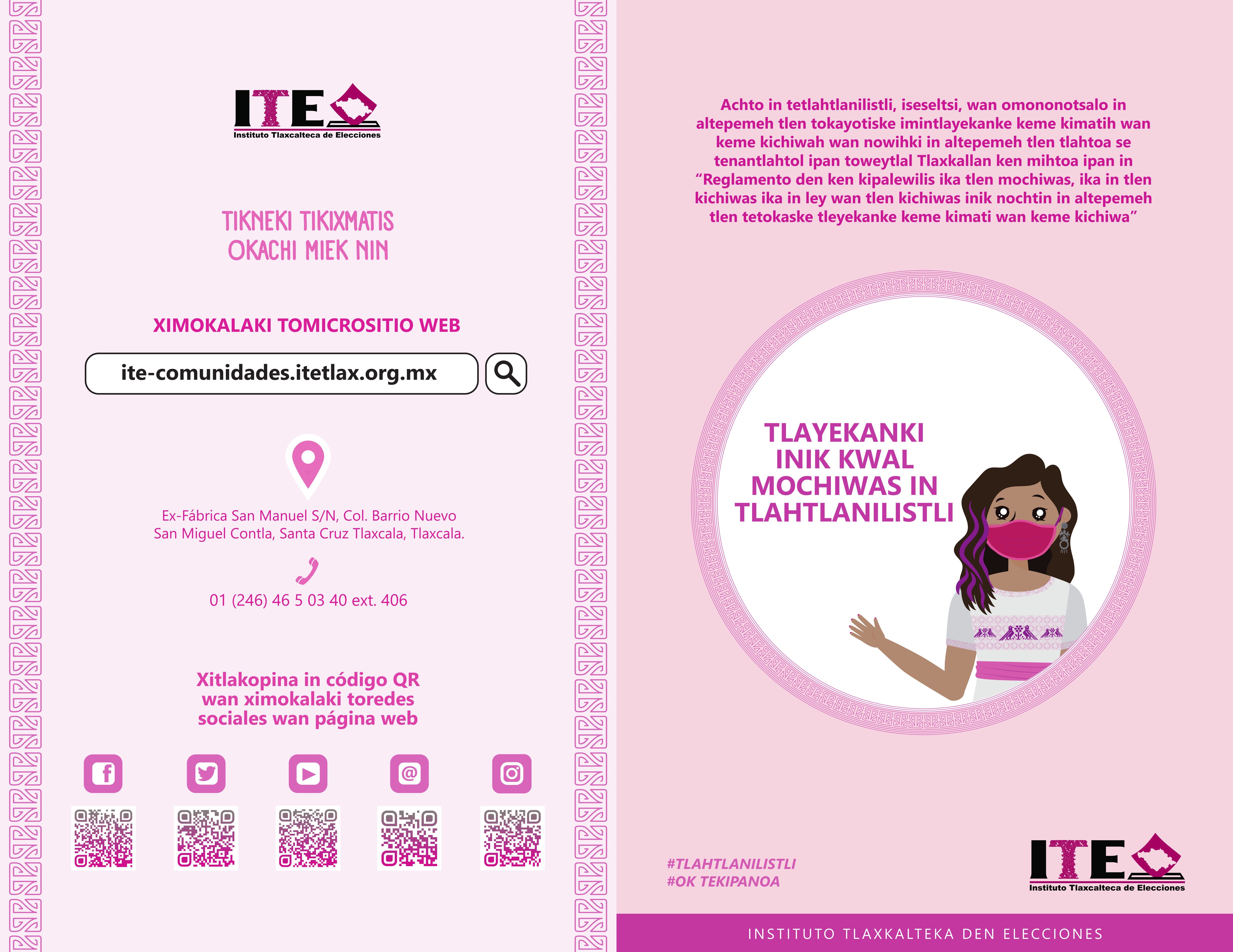 El Instituto Tlaxcalteca de Elecciones (ITE) desarrolla un proceso de consulta previa, libre e informada a las comunidades que eligen a la persona titular de su presidencia de comunidad mediante usos y costumbres, y a las indígenas del Estado, con la finalidad de conocer sus posicionamientos u opiniones sobre diferentes ejes temáticos referentes a normas, principios y criterios que conformarán el Reglamento de Asistencia Técnica, Jurídica y Logística que utilizará esta autoridad cuando las comunidades soliciten asistencia y/o apoyo para sus elecciones. En este sitio encontrarás información relacionada con este ejercicio que es inédito en su tipo en Tlaxcala.