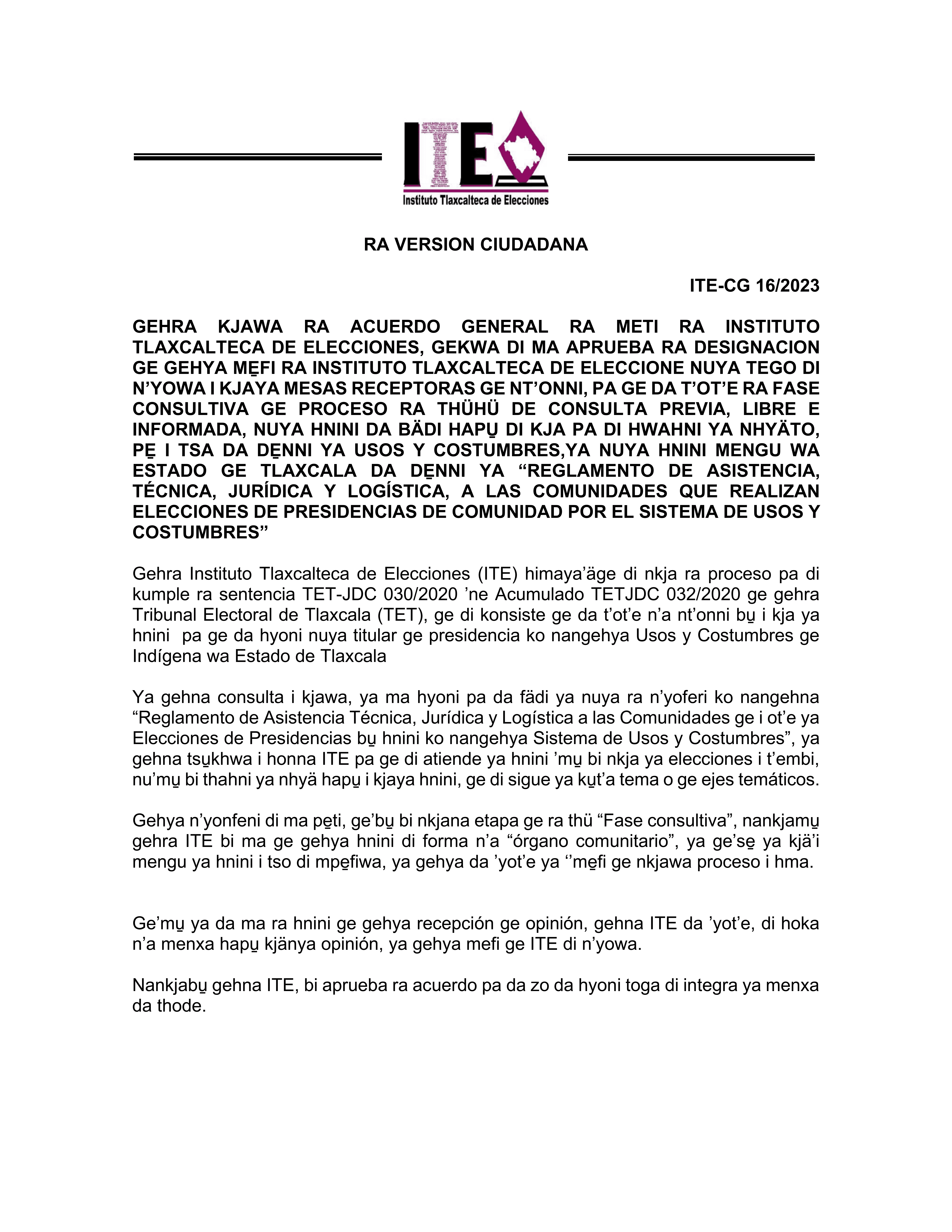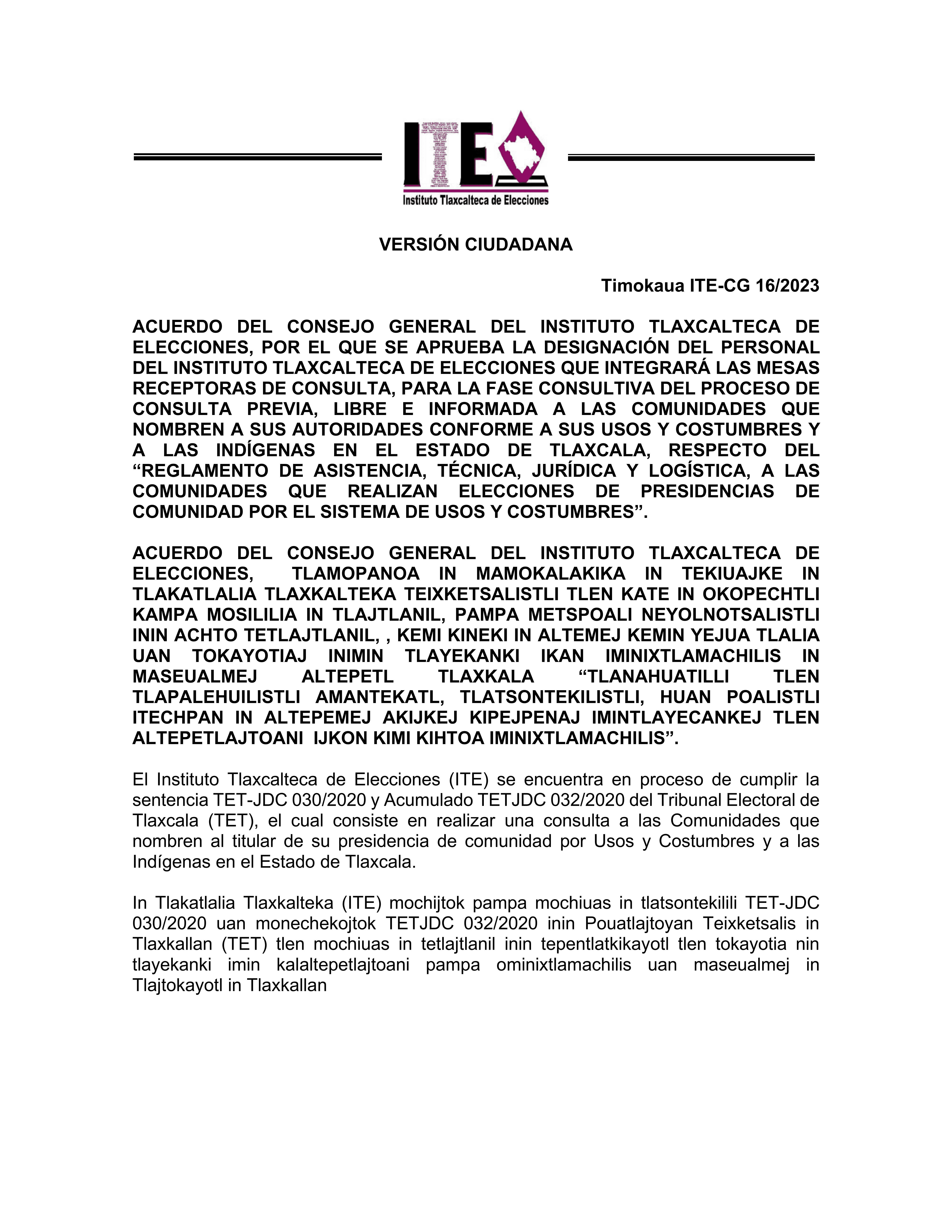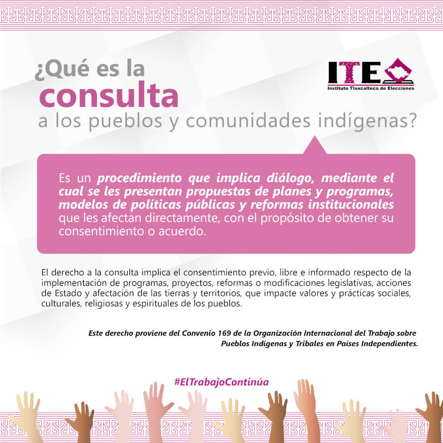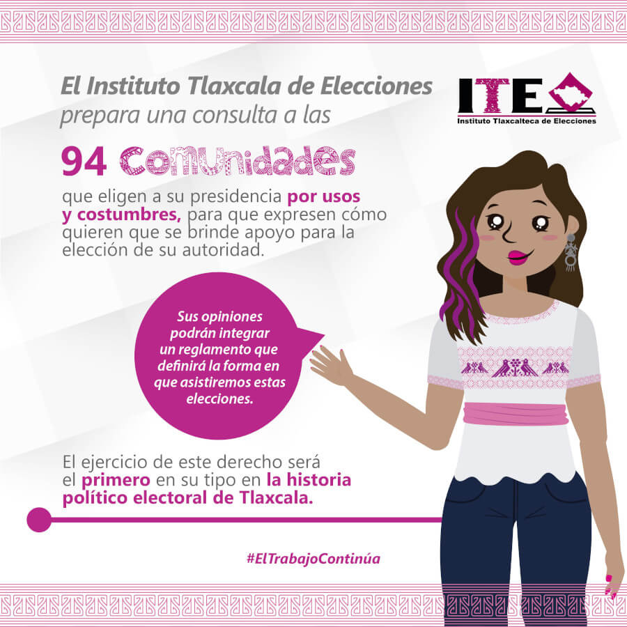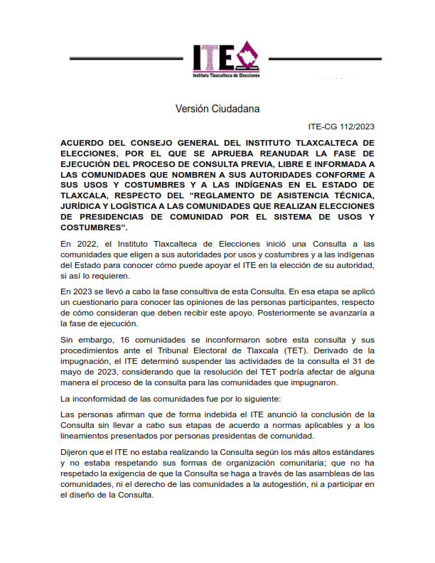 El Instituto Tlaxcalteca de Elecciones (ITE) desarrolla un proceso de consulta previa, libre e informada a las comunidades que eligen a la persona titular de su presidencia de comunidad mediante usos y costumbres, y a las indígenas del Estado, con la finalidad de conocer sus posicionamientos u opiniones sobre diferentes ejes temáticos referentes a normas, principios y criterios que conformarán el Reglamento de Asistencia Técnica, Jurídica y Logística que utilizará esta autoridad cuando las comunidades soliciten asistencia y/o apoyo para sus elecciones. En este sitio encontrarás información relacionada con este ejercicio que es inédito en su tipo en Tlaxcala.