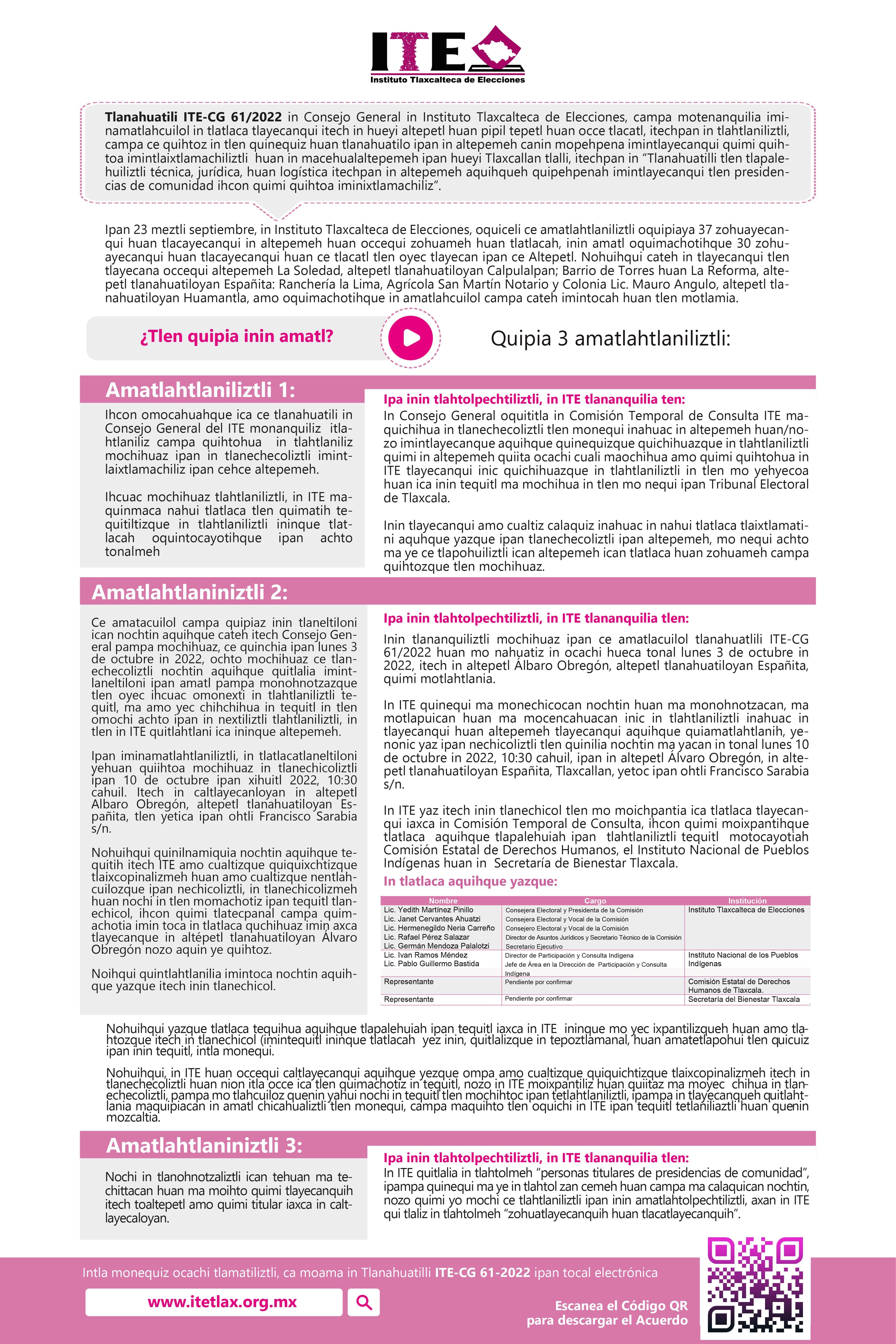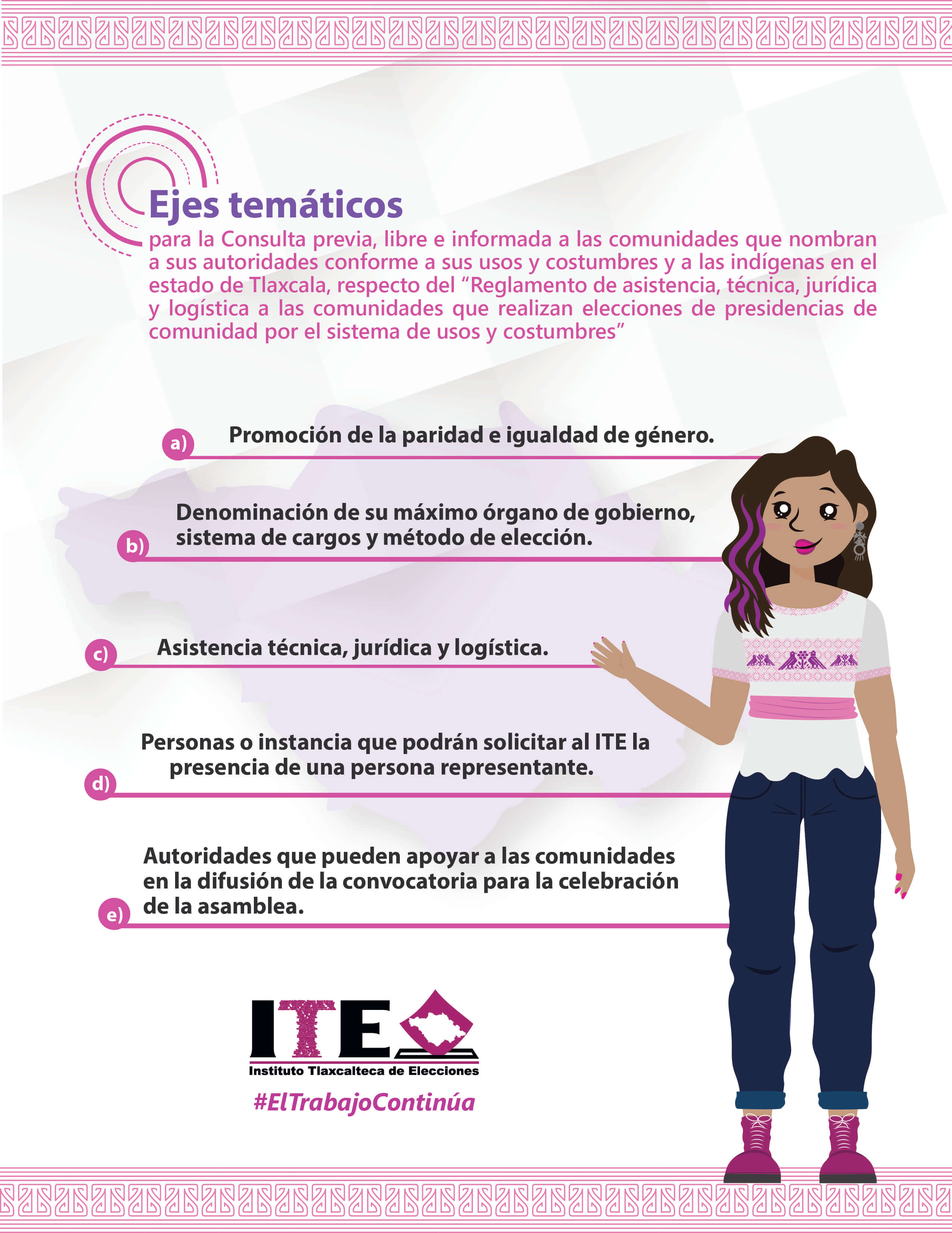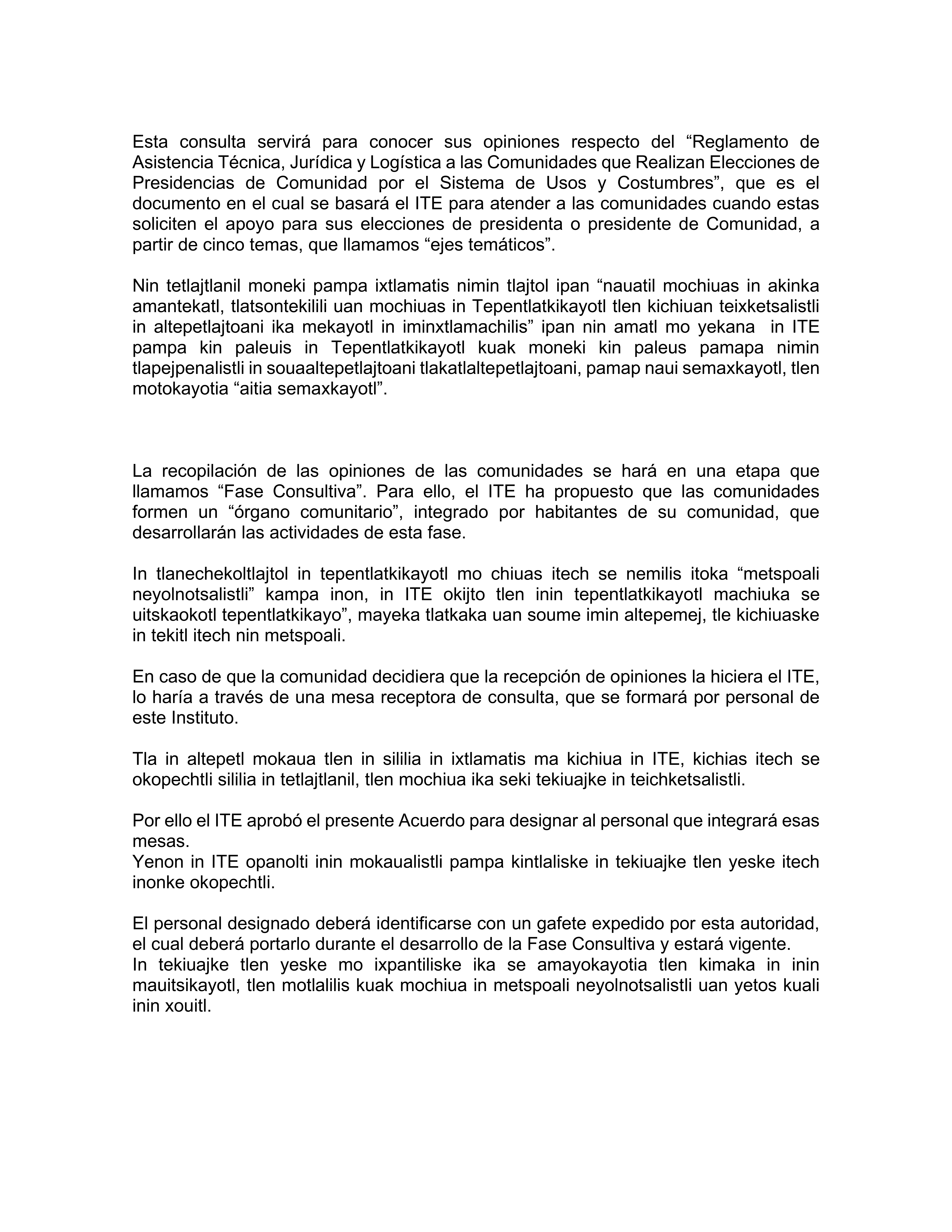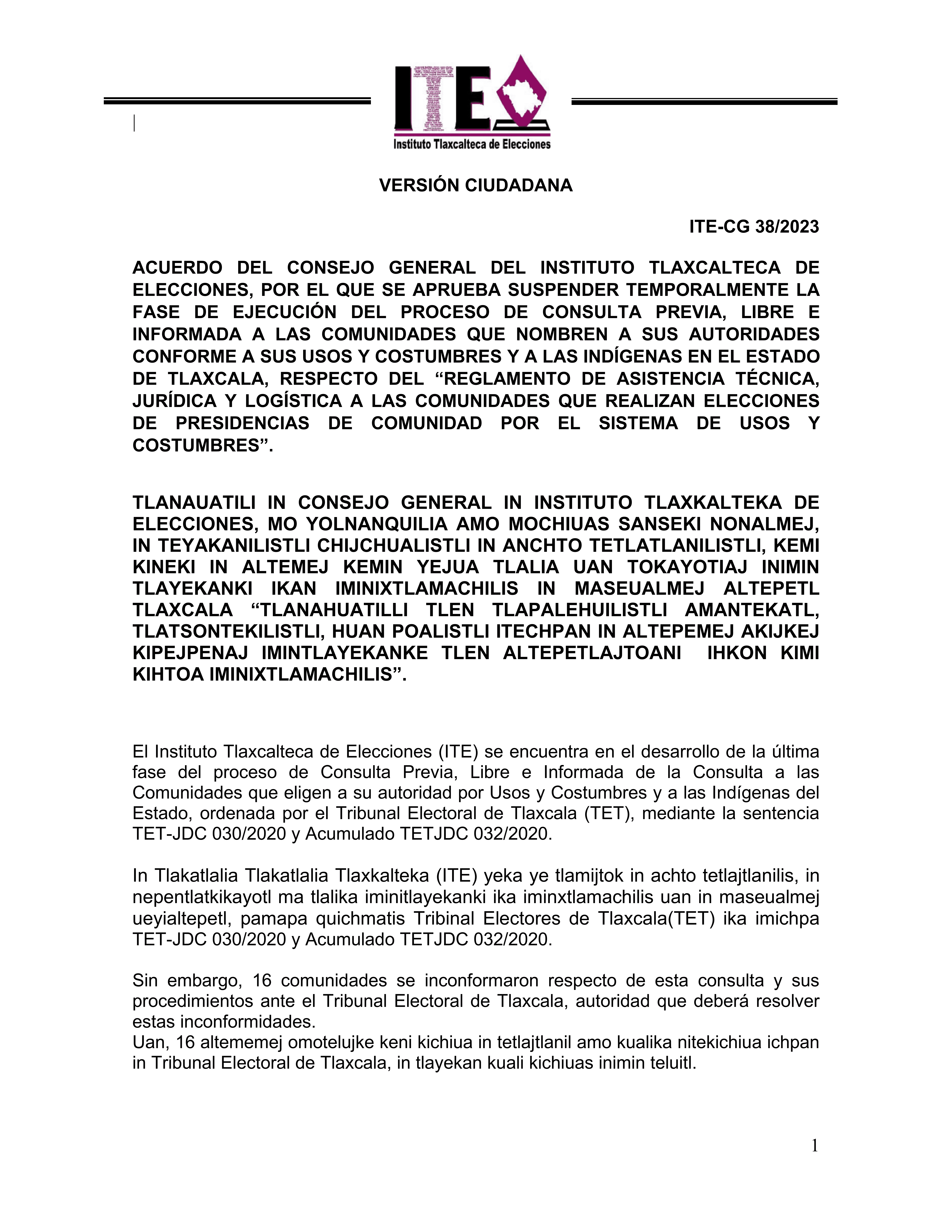 El Instituto Tlaxcalteca de Elecciones (ITE) desarrolla un proceso de consulta previa, libre e informada a las comunidades que eligen a la persona titular de su presidencia de comunidad mediante usos y costumbres, y a las indígenas del Estado, con la finalidad de conocer sus posicionamientos u opiniones sobre diferentes ejes temáticos referentes a normas, principios y criterios que conformarán el Reglamento de Asistencia Técnica, Jurídica y Logística que utilizará esta autoridad cuando las comunidades soliciten asistencia y/o apoyo para sus elecciones. En este sitio encontrarás información relacionada con este ejercicio que es inédito en su tipo en Tlaxcala.