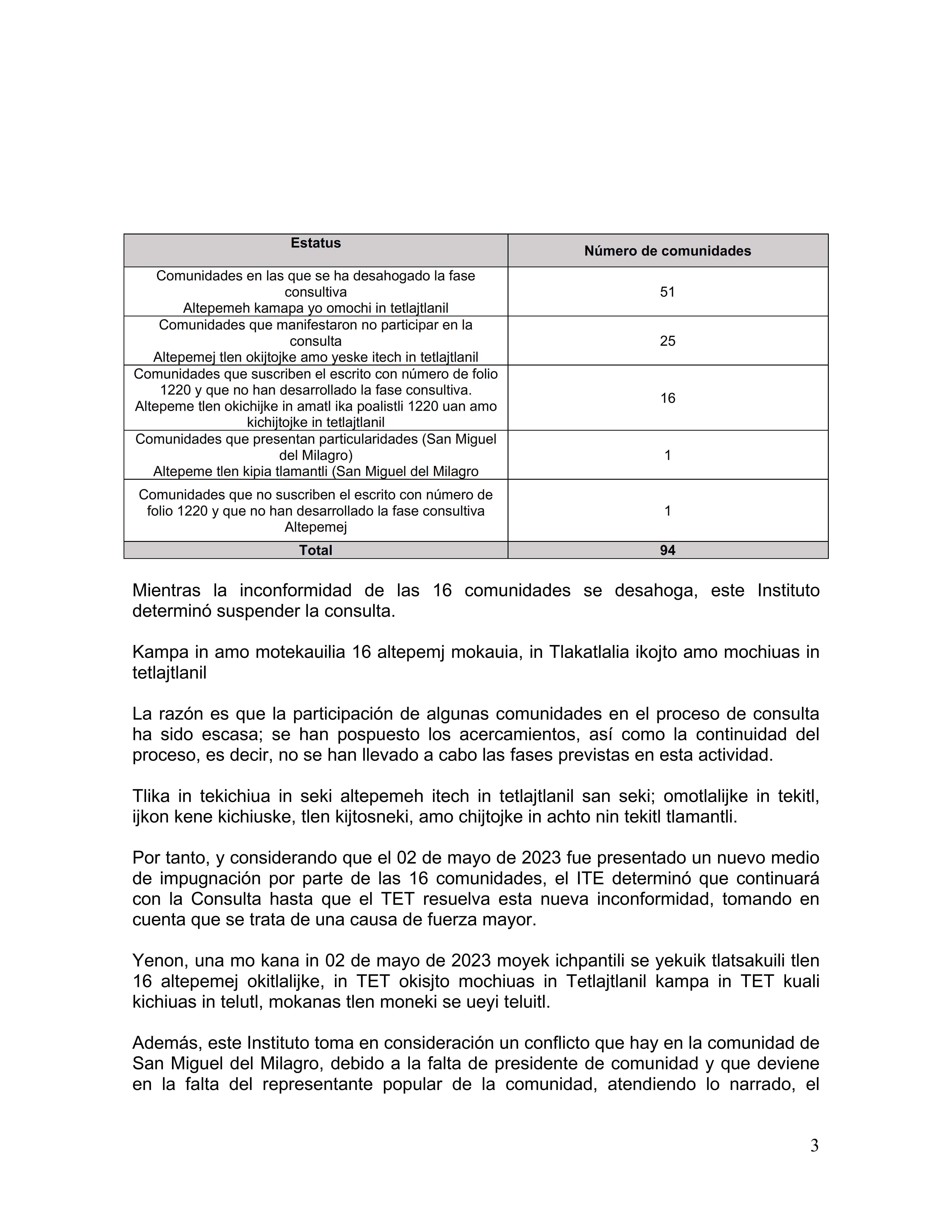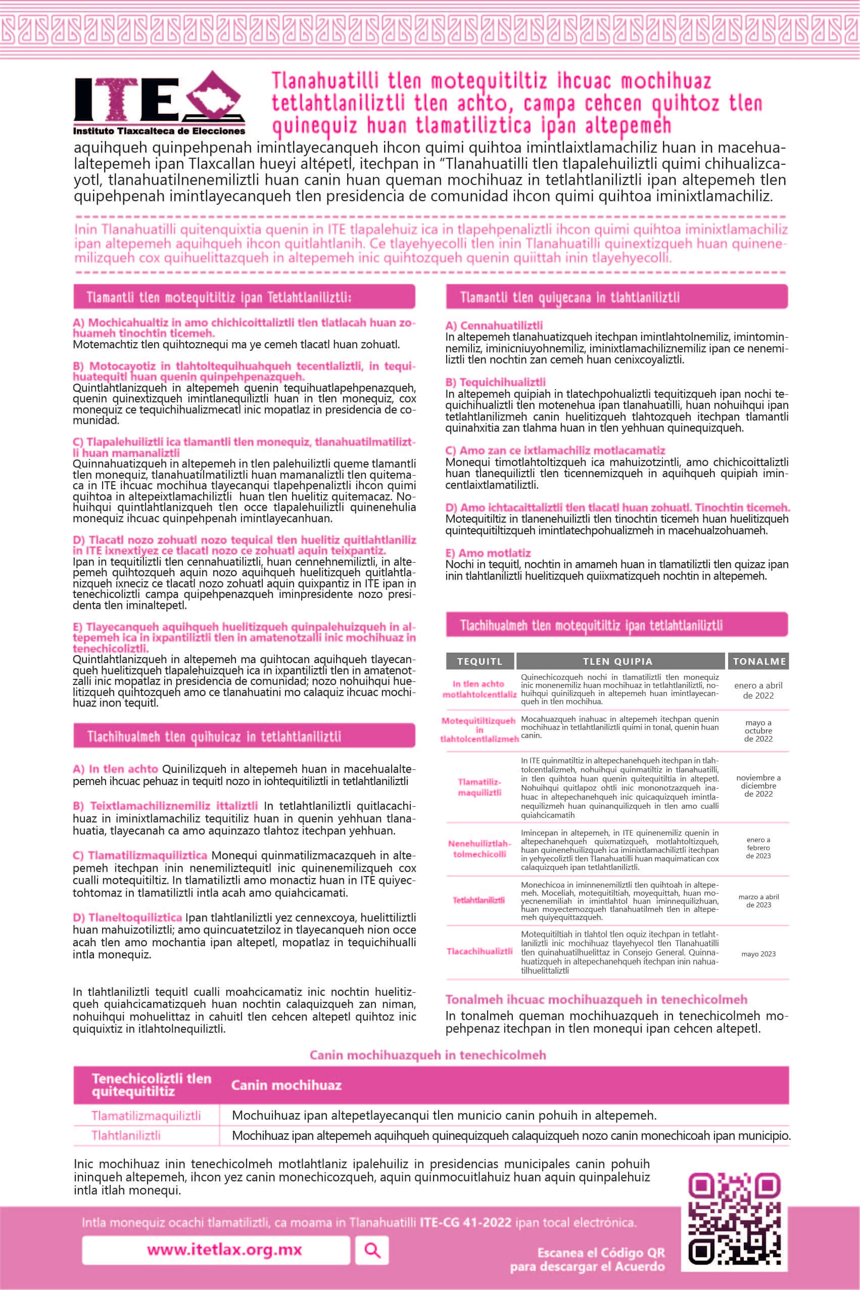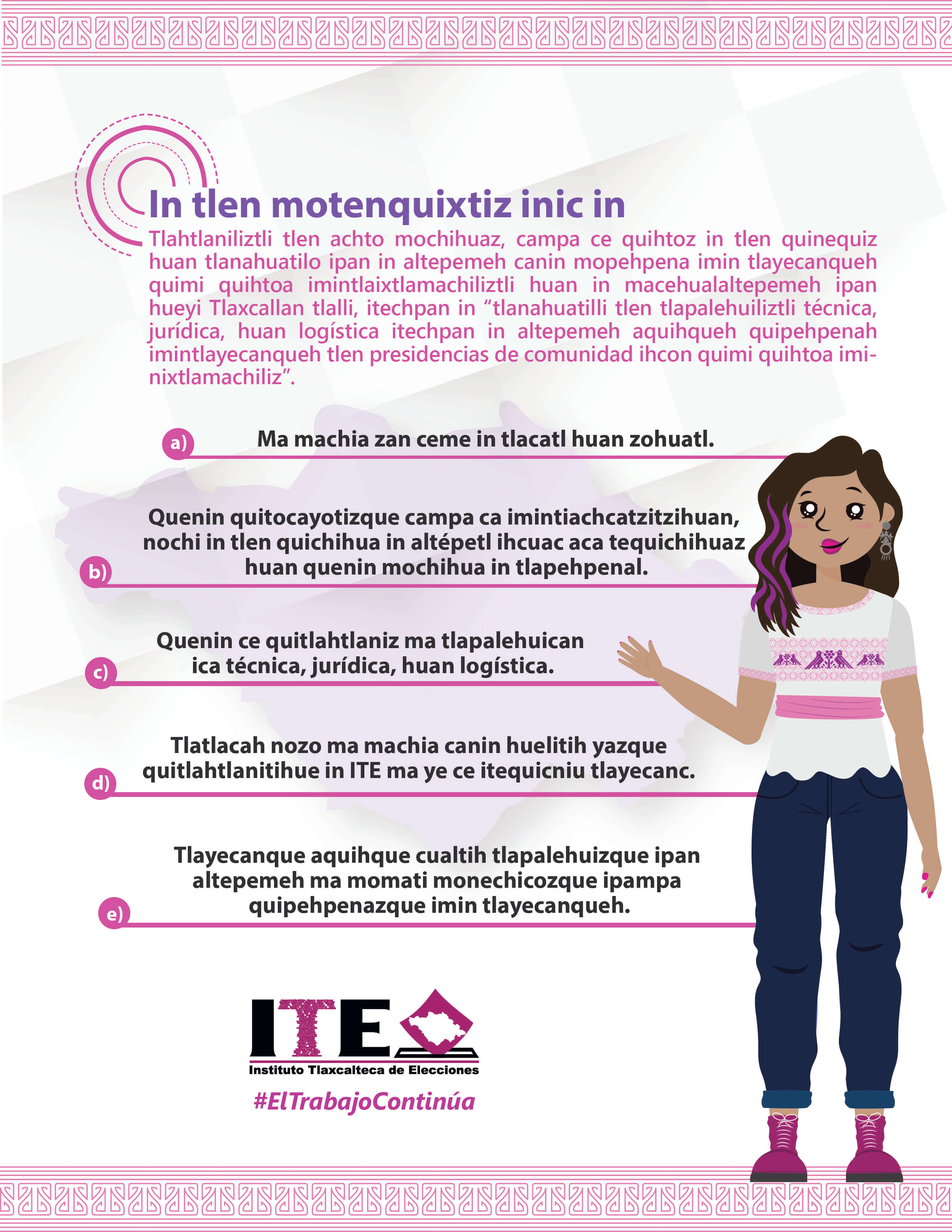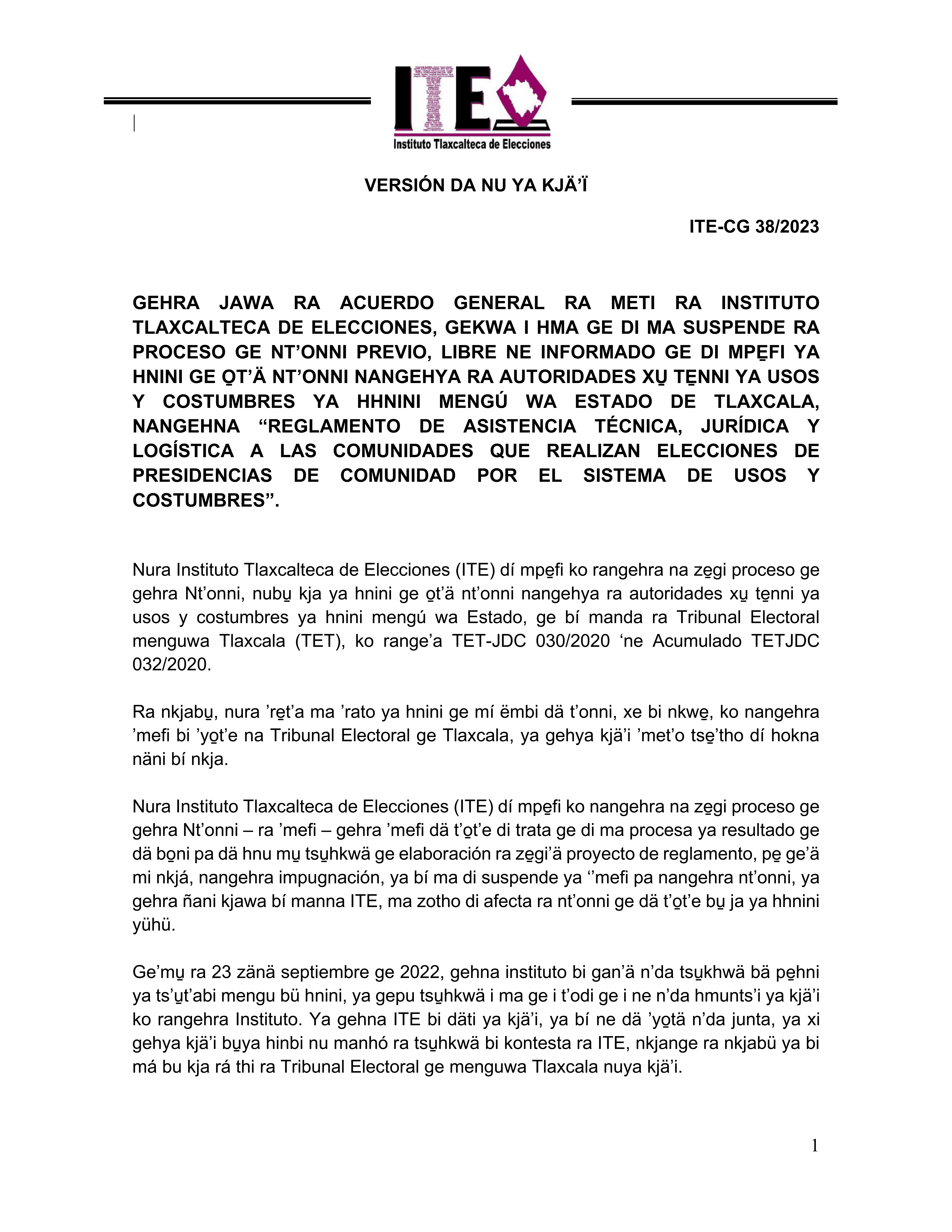 El Instituto Tlaxcalteca de Elecciones (ITE) desarrolla un proceso de consulta previa, libre e informada a las comunidades que eligen a la persona titular de su presidencia de comunidad mediante usos y costumbres, y a las indígenas del Estado, con la finalidad de conocer sus posicionamientos u opiniones sobre diferentes ejes temáticos referentes a normas, principios y criterios que conformarán el Reglamento de Asistencia Técnica, Jurídica y Logística que utilizará esta autoridad cuando las comunidades soliciten asistencia y/o apoyo para sus elecciones. En este sitio encontrarás información relacionada con este ejercicio que es inédito en su tipo en Tlaxcala.